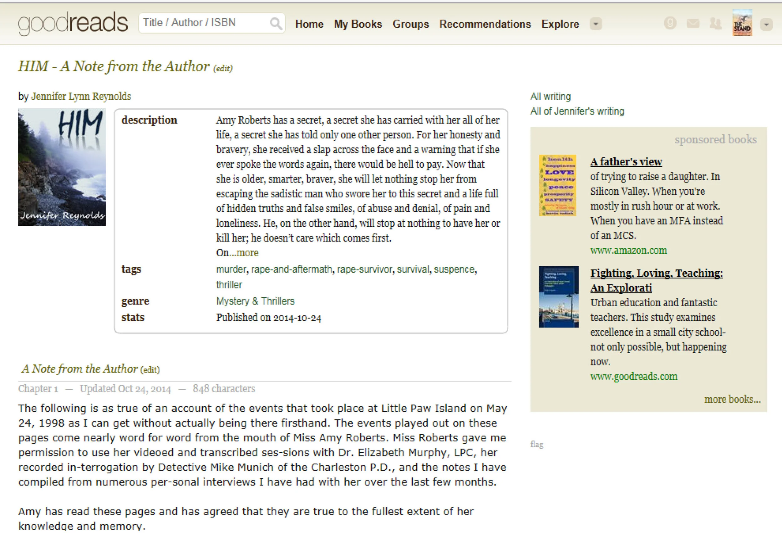 Want to get an early peek at HIM, stop by Goodreads and read the author's note. Chapter One is coming soon. https://www.goodreads.com/story/show/375385-him?chapter=0