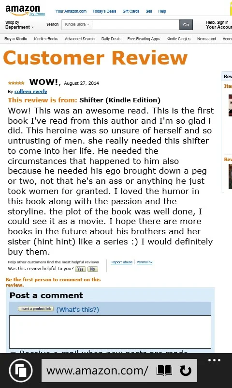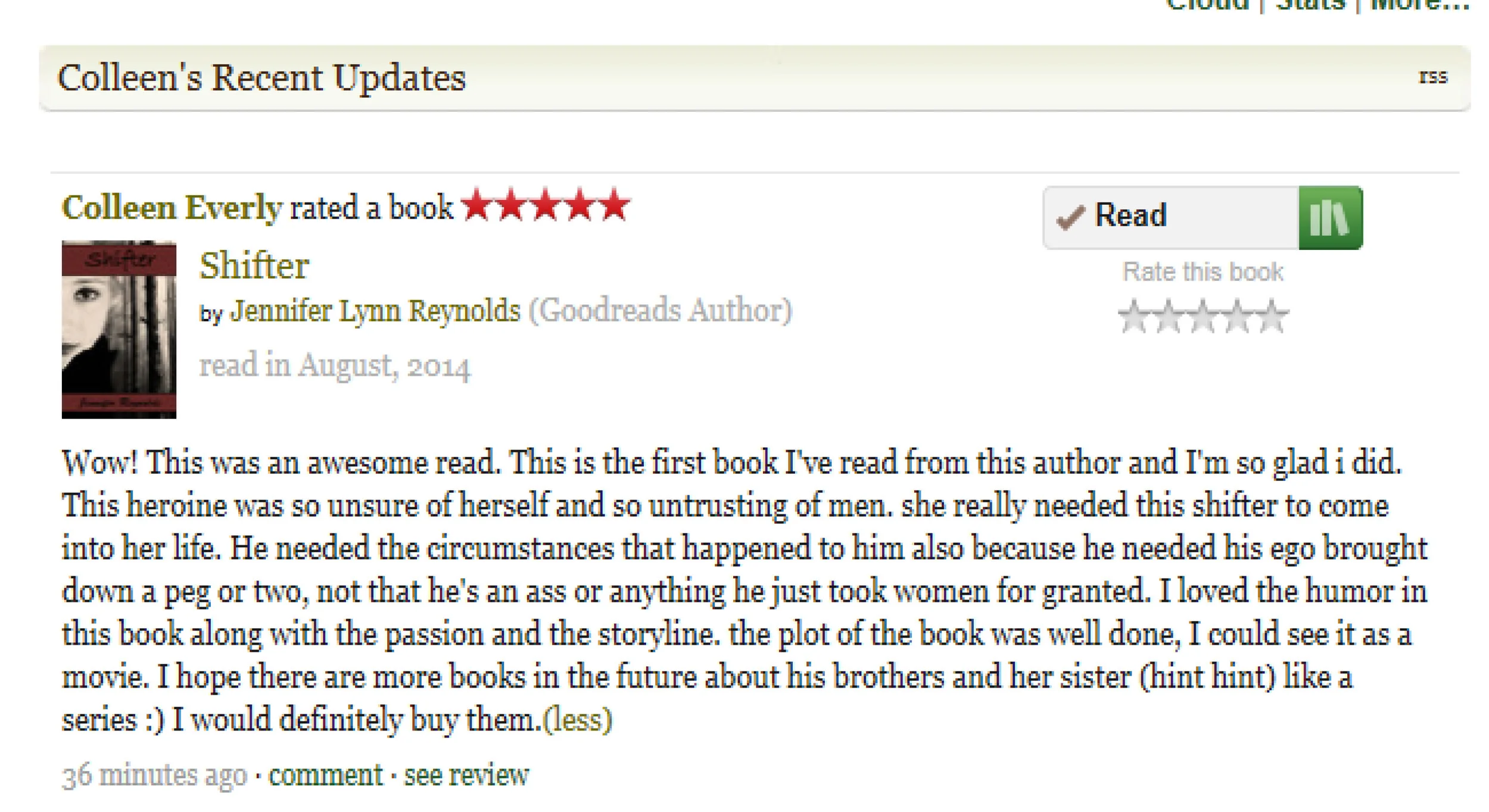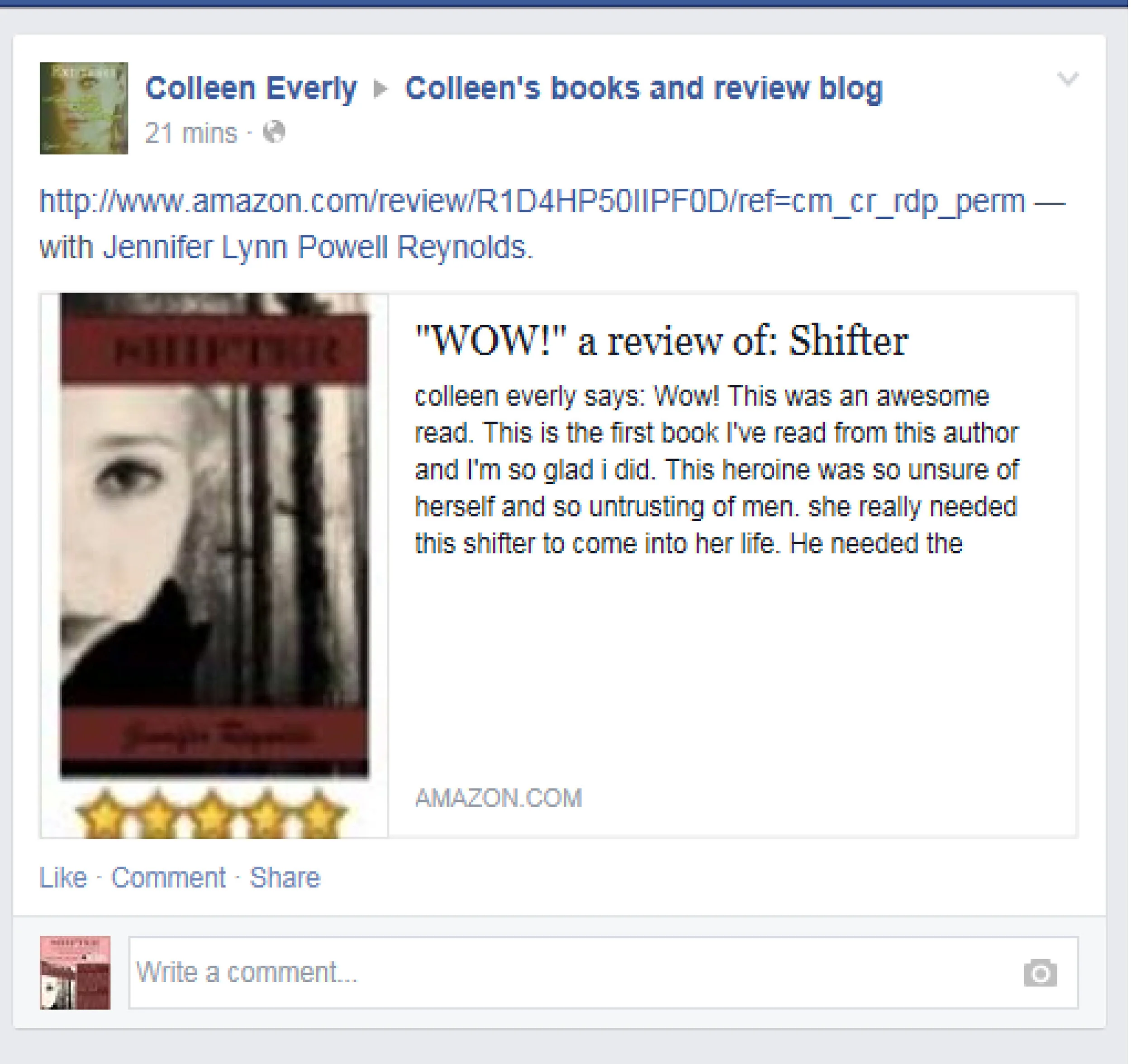 To see Colleen's 5 Star review of SHIFTER, visit Colleen's books and review blog: https://www.facebook.com/colleeneverly71