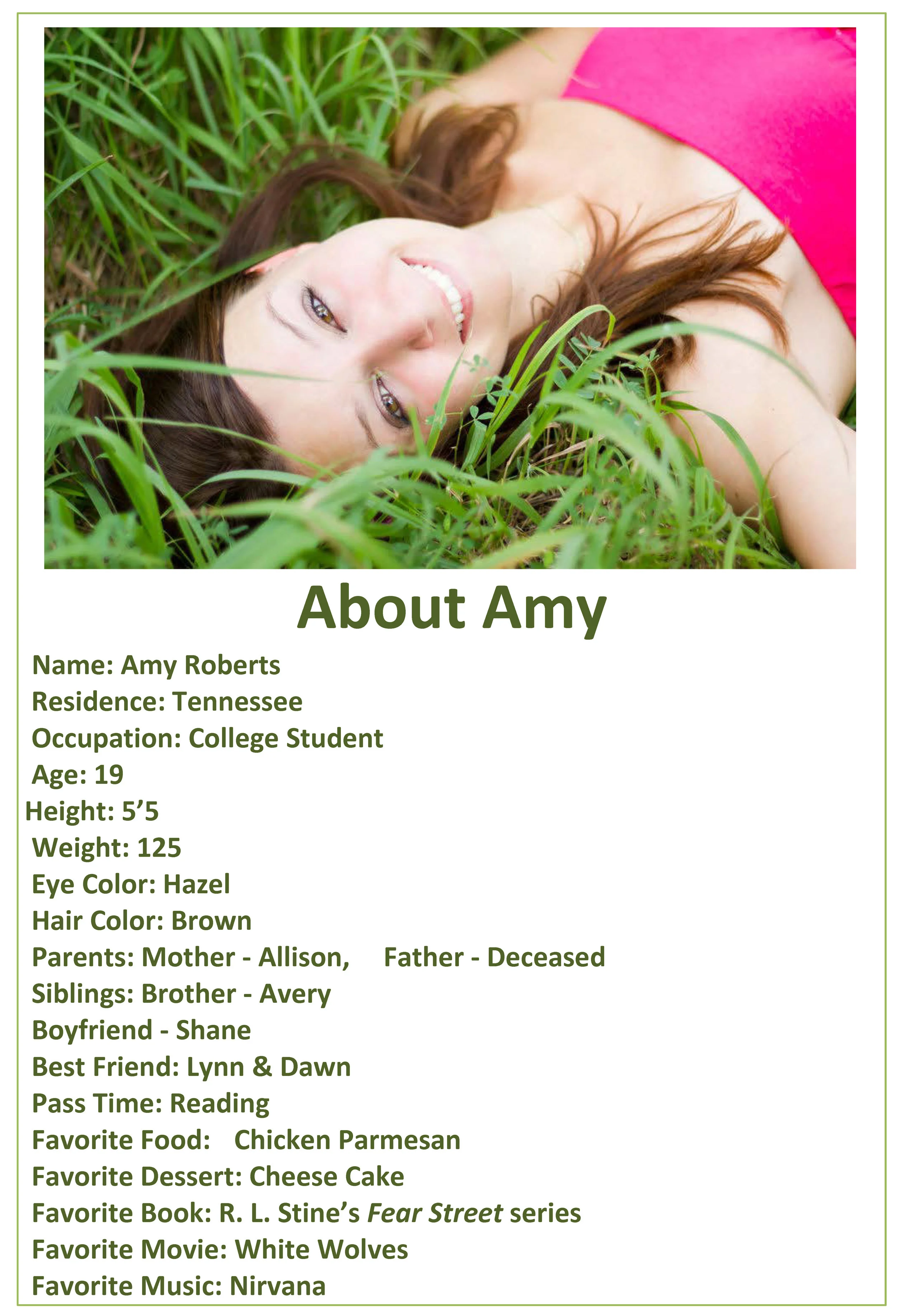 Morning and welcome back to my MMCM blog tour post. Today I would like to introduce you to Amy Roberts, the main character of HIM, my upcoming fictional suspense thriller. HIM is set in Tennessee just west of Nashville and on an island off the coast of South Carolina. Amy is nineteen years old when the novel begins. She lives with her mother and younger brother. Her father is deceased, and her grandparents are the ones who own the island where most of the novel takes place. Amy likes to read, watch television, and hang out at the mall with her friends, as most teenagers do. She doesn’t have much of a love life due to her traumatic childhood, but she has been tentatively seeing an employee of the resort her grandfather owns.