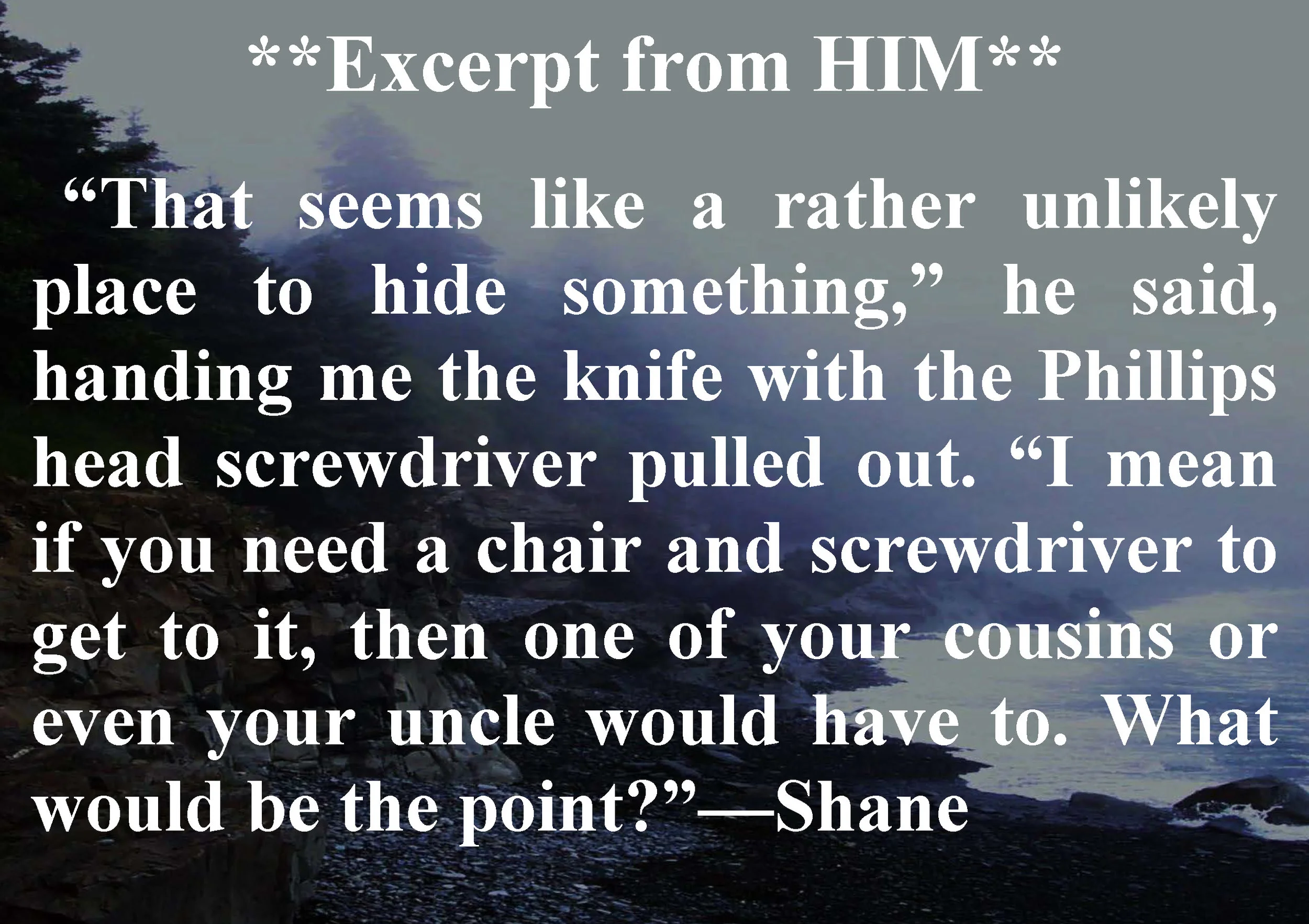 Excerpt from upcoming novel, HIM, a suspense thriller. January 9, 2015 To discover what they are looking for, download you copy of this novel the day it goes on sale at the end of February.To find out more about this novel, visit: https://www.facebook.com/HIMaNovel , https://jennifer-reynolds-thzu.squarespace.com/#/him/ , orhttp://www.pinterest.com/talisman1222/him/To add this novel to your Goodread to-read list visit: https://www.goodreads.com/book/show/24377181-himTo read an un-edited draft of the first few chapters of this novel visit: https://www.goodreads.com/story/show/375385-him?chapter=0