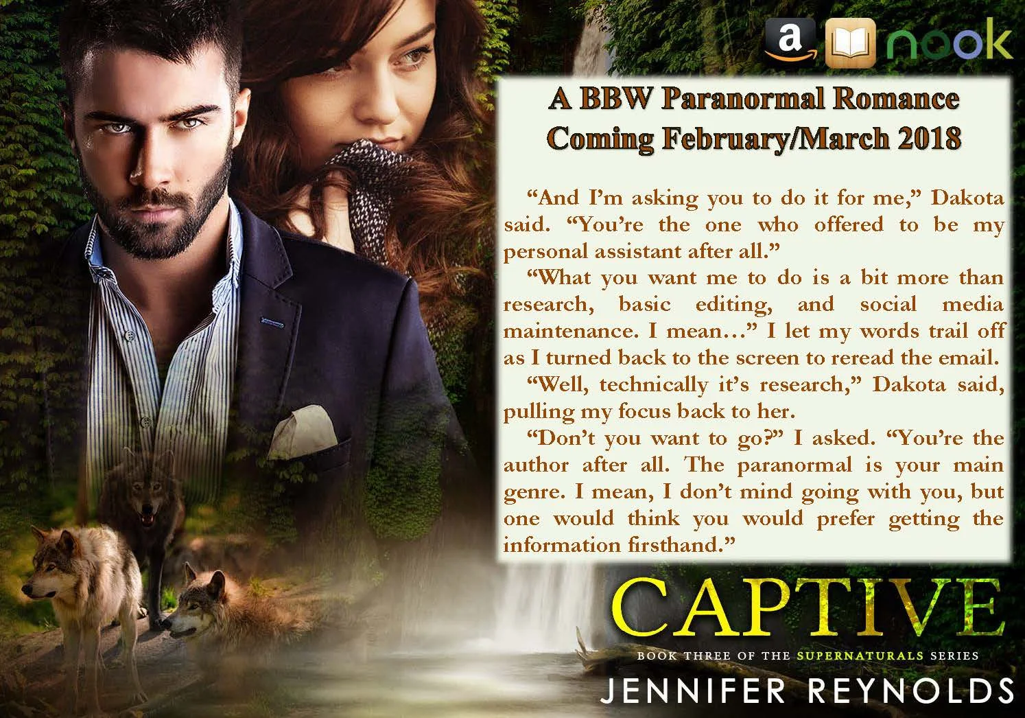 Today, I’m sharing from upcoming paranormal romance, Captive, book three of my Supernaturals series. This novel has just come back from its last round of edits. My goal is to send it to my betas in the next week or so and release it around the end of February or the beginning of March.